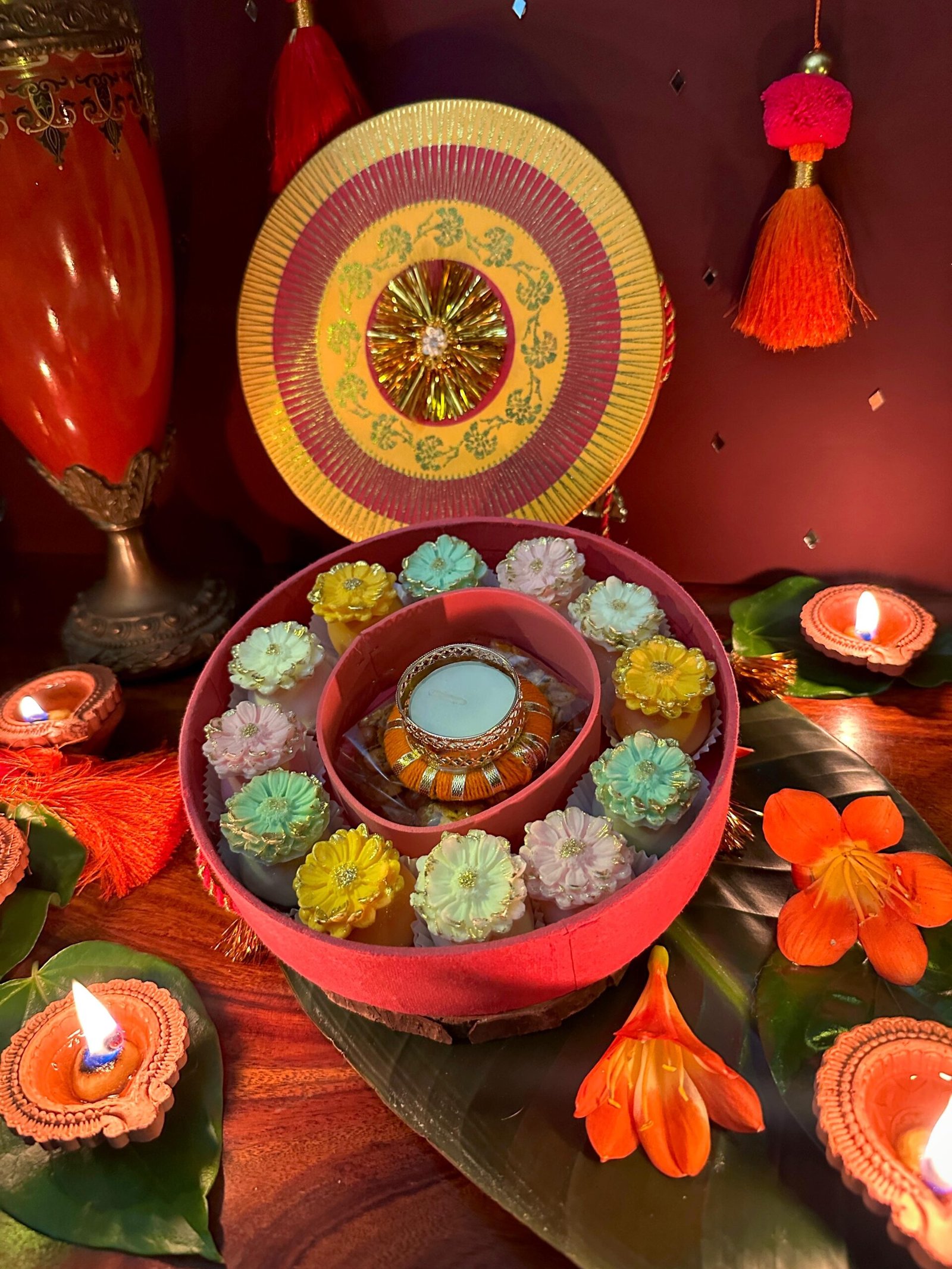 A round treasure of handcrafted indulgence, our Kangan Box is designed to delight at first glance, and at first bite. Inside, discover a curated selection of almond burfee truffles, pista burfee truffles, mango burfee with tutti frutti filling, crisp chevda and the festive surprise of burfee with boondi laddoo filling.